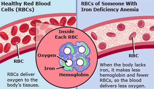 Iron-deficiency anaemia means that the body does not have enough iron. The body needs iron to help carry oxygen through the blood to all parts of the body. Iron deficiency anaemia may be caused by a diet consistently low in iron; blood loss due to heavy menstrual bleeding; poor iron absorption and pregnancy.